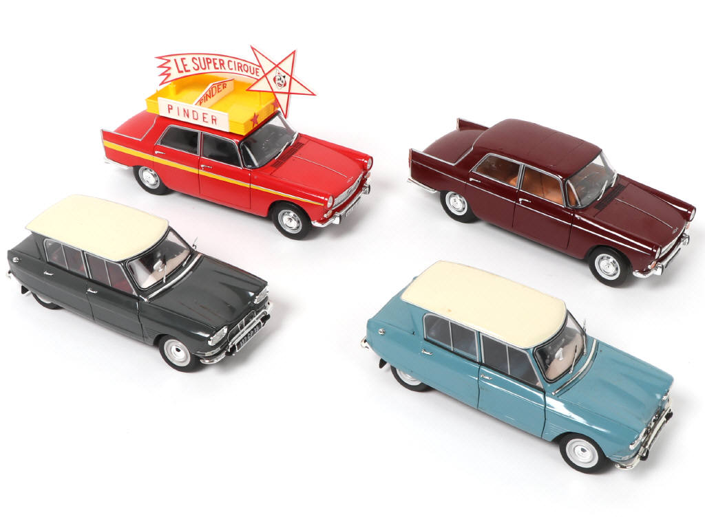 échelle 1/18ème - on y retrouve les modèles : CITROËN AMI 6 & PEUGEOT 404 (comprenant un exemplaire du cirque PINDER) - modèles légèrement encrassés - possibilité de petits manques & parties cassées