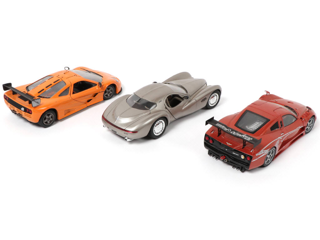 échelle 1/18ème - on y retrouve les modèles : CHRYSLER ATLANTIC CONCEPT, HISPANO SUIZA H521 GTS & MCLAREN F1 - modèles légèrement encrassés
