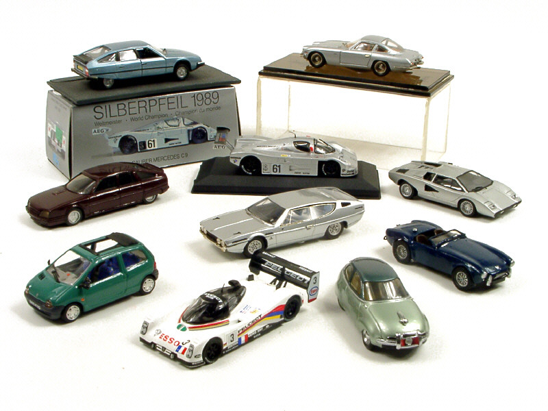 miniatures reproduisant les véhicules : CITROËN, PANHARD, SAUBER MERCEDES, AC, PEUGEOT, LAMBORGHINI & RENAULT - on y retrouve notamment les marques : MIKADO, SMITH, SMTS, HECO MODELES, AUTO REPLICAS, DENZER, IDEM, MAX MODELS & VITESSE - 2 modèles avec boîte