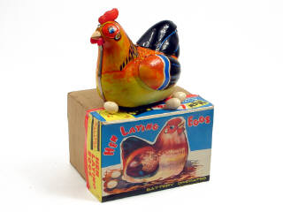 longueur 17 cm - en tôle lithographiée - moteur à piles (fonctionne) - en action, la poule tourne en rond en pondant ses oeufs (avec peine) tandis qu'elle caquette - avec 4 oeufs