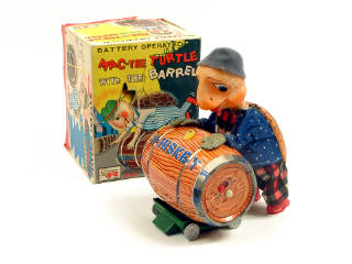 hauteur 22 cm - en action, la tortue pousse un tonneau de whisky - elle se laisse entraîner & se retrouve sur le dessus du tonneau - la tête & les pieds bougent - mécanismes fonctionnent - le caoutchouc des mains a séché - une main recollée