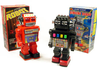 hauteur 31 cm - moteur à piles (fonctionne) - en action, le robot avance tout en jouant un air musical - yeux lumineux à revoir
