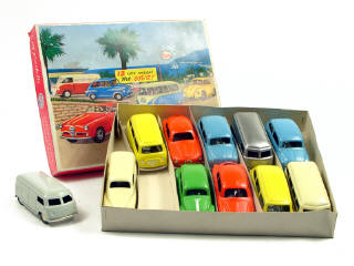 contient : 3 VOLKSWAGEN COMBI, 2 FIAT MULTIPLA, 2 ALFA ROMEO GIULIETTA, 2 FIAT 600, UNE VOLKSWAGEN COCCINELLE & une fourgonnette - modèles en tôle peinte avec moteur à friction (fonctionne) - un modèle manquant (ce coffret contenait initialement 12 modèles)