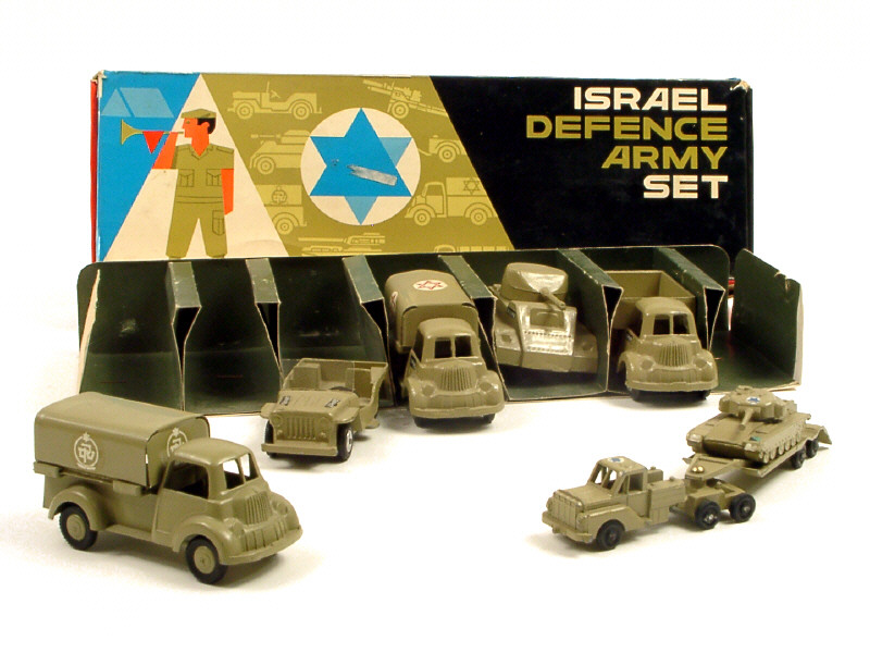 contient : un véhicule blindé, un char CENTURION, 2 camions bâchés, un camion-plateau à ridelles, une JEEP & un transport de char MIGHTY ANTAR - le coffret contenait initialement un canon avec caisson à munitions qui a été remplacé par le transport de char
