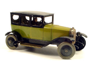 longueur 27 cm - fabrication de 1925-1932 - moteur à ressort (fonctionne) - avec conducteur - direction par le volant - petites traces d'oxydation sur la calandre - ETAT EXCEPTIONNEL POUR UN MODELE DE CETTE EPOQUE !