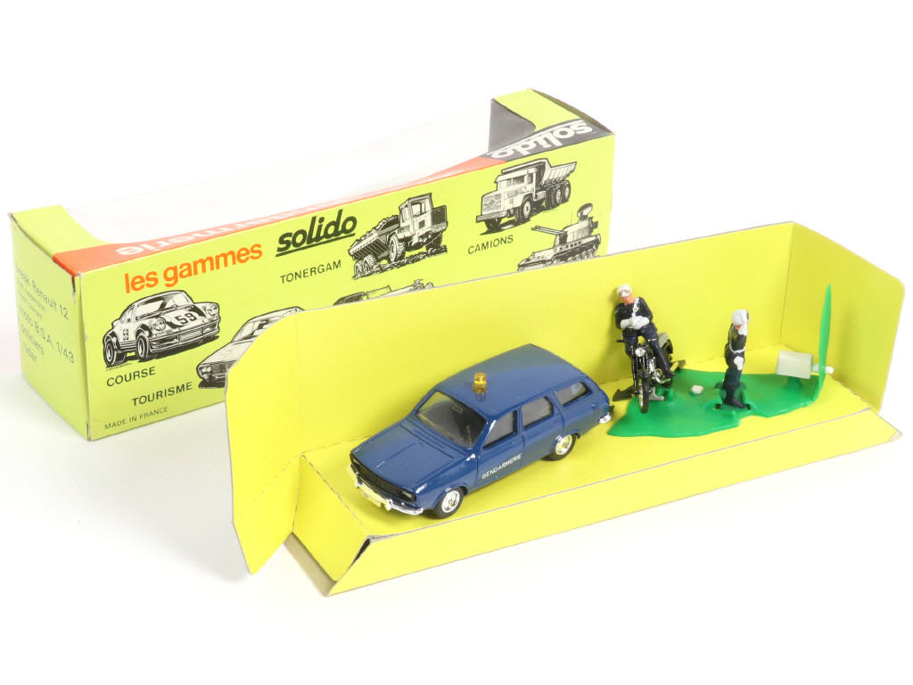 contient : RENAULT 12 break, moto BSA, 2 gendarmes, un buisson & un radar (véhicules & figurines à repositionner sur le socle de boîte)
