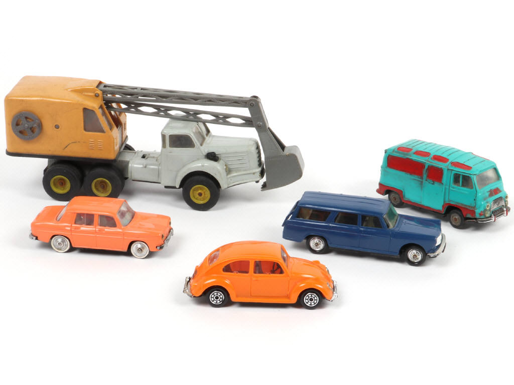 on y retrouve notamment les modèles : VOLKSWAGEN COCCINELLE, PEUGEOT 404 break (hayon légèrement déformé), RENAULT 8, ESTAFETTE (état 'R') & BERLIET TBO - quelques manques & parties cassées - 2 modèles encrassés