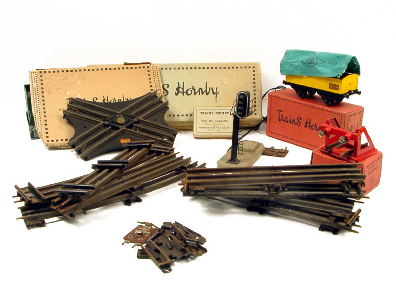 états de 'B' à 'C' - comprend : un wagon bâché 'SAINT FRERES' (petits manques) avec boîte, un heurtoir n°1 avec boîte, un croisement oblique avec boîte, un rail de coupure avec boîte, une paire d'aiguillages avec boîte, un signal à 4 feux & 18 rails avec broches d'assemblage