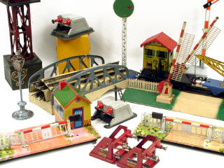 états de 'B' à 'R' - comprend : un wagon-grue, un wagon-plateau à ranchers, 3 passages à niveau, un pont, une barrière de passage à niveau, 4 heurtoirs (dont un avec boîte), 3 signaux, 4 éléments de pont, un réverbère & un mirador de voie - on y retrouve notamment les marques : JEP, HORNBY & MÄRKLIN