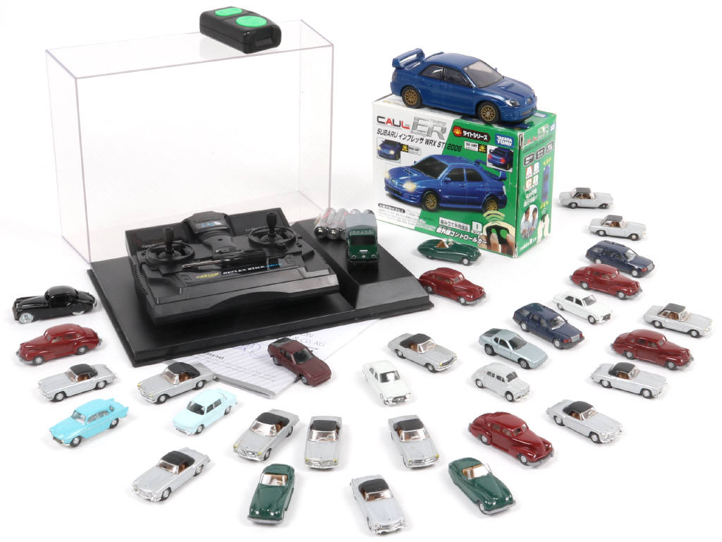 échelle 1/87ème - non testé - avec 4 piles, un tournevis, notice & radiocommande - on y joint 31 voitures (HO) des marques : MATCHBOX, HERPA, WIKING & NOREV (production récente, une roue manquante, en état 'A') ainsi qu'une SUBARU radiocommandée de la marque TOMY (non testé, état 'A.b', un rétroviseur à positionner)