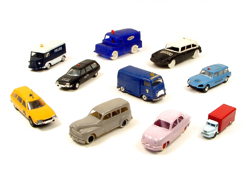 états de 'B' à 'F' - miniatures reproduisant les marques : RENAULT, CITROËN, PEUGEOT, PANHARD, BEDFORD & UNIC - on y retrouve notamment les marques : CLE, MINIALUXE & INJECTAPLASTIC