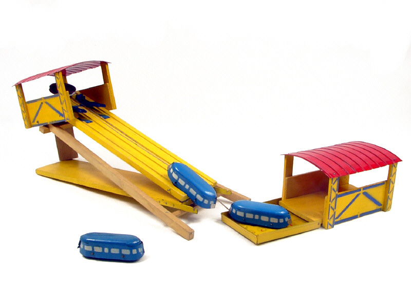 dimensions : 90 x 40 cm - 2ème version de 1956 - tôle & bois - mouvement à billes faisant monter & descendre simultanément les deux cabines - avec une cabine supplémentaire - manque billes