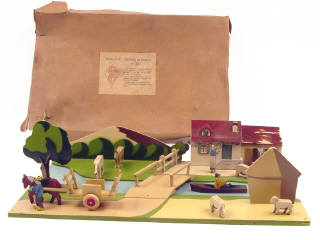 dimensions : 46 x 28 cm - en bois peint - représente une ferme, un cours d'eau, différents animaux, 3 personnages & une charrette
