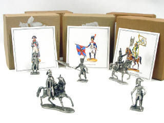 figurines représentant : 2 NAPOLEON BONAPARTE dont un à cheval, le général CAMBRONNE, un sous-officier de dragons à cheval & un grenadier d'infanterie de ligne - chaque figurine est accompagnée d'une petite image représentant le soldat avec son historique