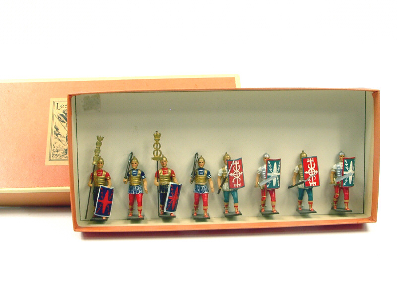 comprend : 2 soldats avec pilum, 2 avec gladius, 2 licteurs & 2 porte-enseignes - légère décoloration du couvercle de boîte - avec petit récit historique en français & en anglais se rapportant aux personnages - réédition