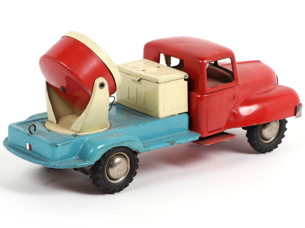 B.S (ALLEMAGNE) Camion plateau avec projecteur en tôle peinte rouge, bleu & crème