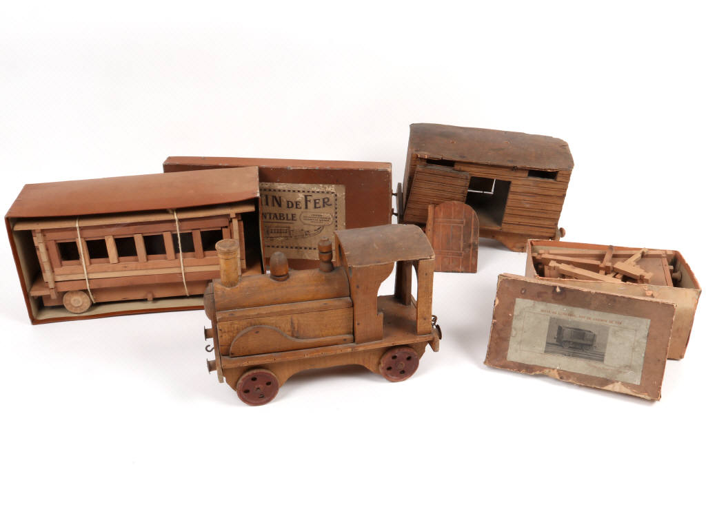 DIVERS Ensemble d'une locomotive & de 3 matériels ferroviaires en bois