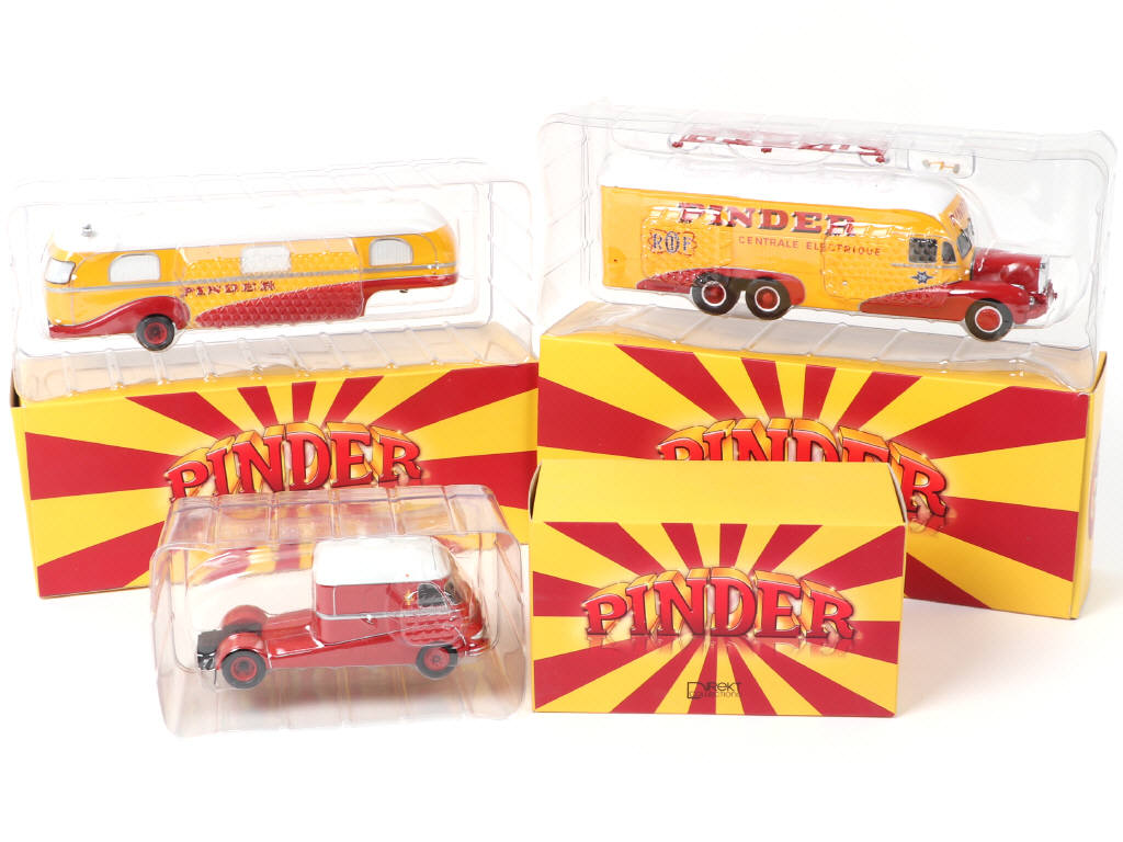 DIREKT COLLECTIONS (CH) Ensemble de 2 camions & une remorque du cirque 'PINDER' jaune & rouge