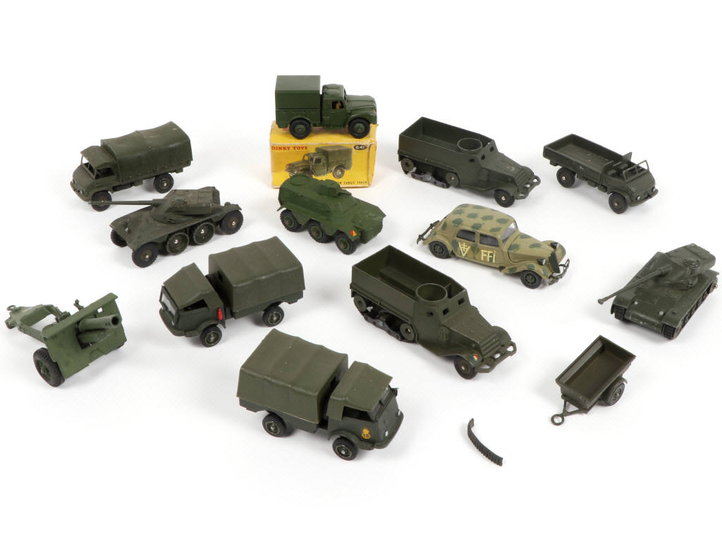 DIVERS Ensemble de 11 véhicules militaires, une remorque & un canon