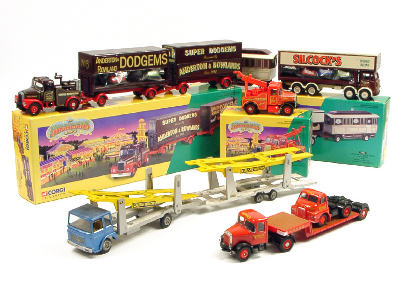 série 'CORGI CLASSICS' - avec sachet de rétroviseurs, piste d'autos tamponneuses à découper, petit carton d'inscription au club, un ticket gratuit pour un tour, chargement de 8 autos tamponneuses, 4 planches de numéros autocollants & certificat d'édition limitée n°9529/14300 - légères traces d'humidité sur les chromes du tracteur