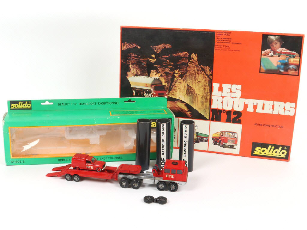 avec manques & parties cassées - contient : BERLIET T12 'STE' semi-remorque avec chargement , RENAULT 4 fourgonnette 'STE' - accrocs sur la boîte & blister décollé - encrassé - on y joint un coffret vide 'LES ROUTIER' n°12 en état 'b'