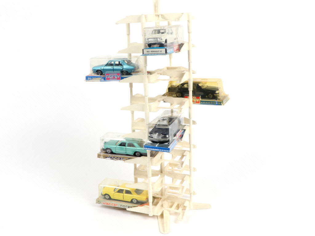 comprend : présentoir en plastique de 47 cm (état 'C' - manque enseigne - petites restaurations & parties cassée - encrassé), 4 MERCEDES 280 & 2 RENAULT 12 (4 blisters ouverts) - boites en états 'b' à 'c'