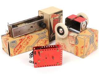 un exemplaire avec train roulant fonctionnel (marche avant/arrière) - agrafes de boîtes oxydées - on y joint un moteur à clef de la marque MIGNON (à revoir, avec clef & notice) en état 'B-b'