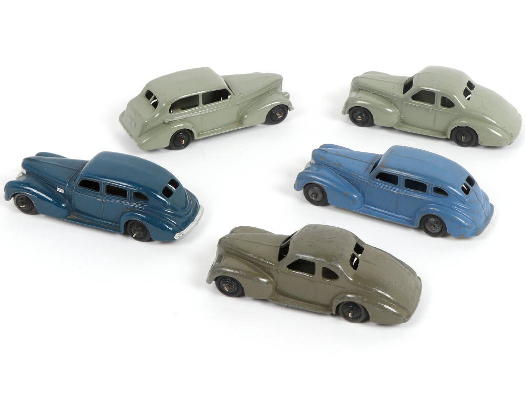 fabrications avant-guerre - comprend : CHRYSLER (2 exemplaires dont un avec détails de peinture argentée ajoutés), OLDSMOBILE & STUDEBAKER (2 exemplaires) - pneus plus ou moins séchés - quelques axes de roues légèrement oxydés - ensemble présenté dans un coffret de fabrication moderne de grande qualité