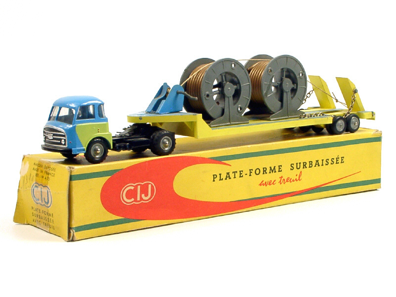 C.I.J. (FRANCE) 4/75 SAVIEM LRS Semi-remorque surbaissée porte-bobines de câble bleu & jaune vert