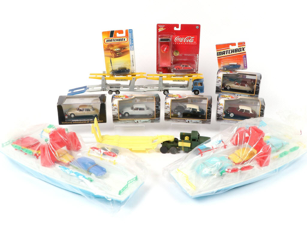 différentes échelles - comprend notamment : 2 bateaux en plastique avec 3 CITROËN DS, un porte-auto 'SOLIDO' & DS 'MATCHBOX' - possibilité de petits manques & parties cassées