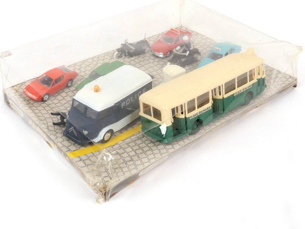 contient : PEUGEOT 504 'TAXI', RENAULT ALPINE, CITROËN GS 'AUTO-ECOLE', H 'POLICE', VOLVO 144, SOMUA autobus parisien, un policier dans sa guerite de circulation & 2 motards de la police sur leur moto - ensemble maintenu par ficelle sur socle cartonné - mica déformé & craquelé (agrafé au socle)