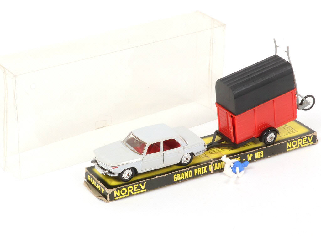 contient : une BMW 2000 avec jockey, van (fixations de bâche cassées & manquantes en grande majorité), sulky & cheval - carrosserie de la BMW très légèrement encrassée & jaunie - accrocs sur la socle de boîte