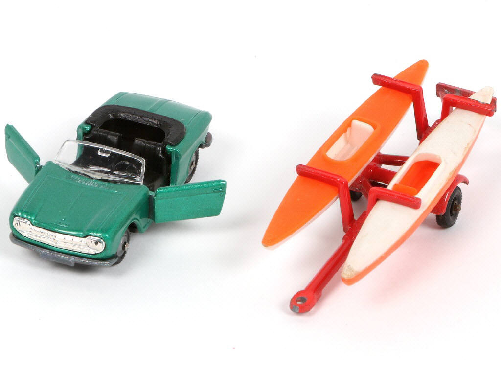 MAJORETTE (FRANCE) 331 PEUGEOT 204 cabriolet avec canoës sur remorque vert, orange & blanc