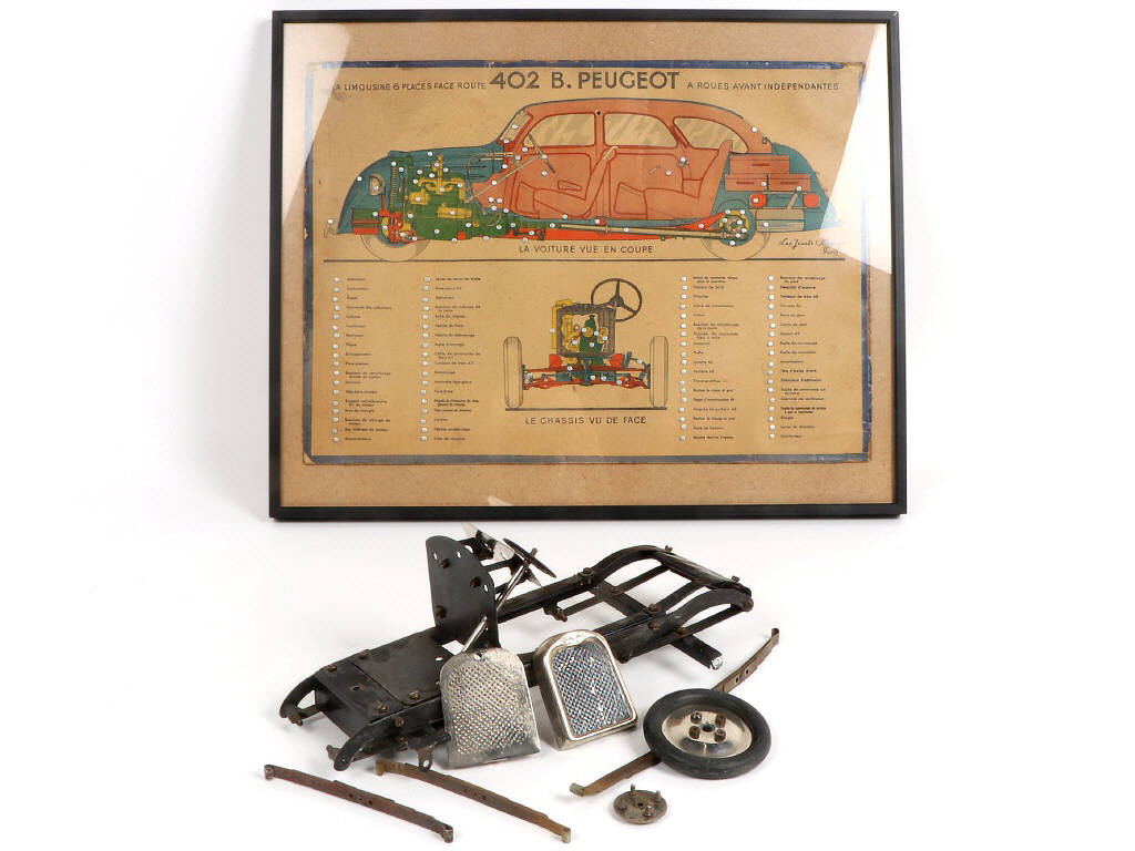 longueur : 31 cm - traces d'oxydation plus ou moins importantes par endroits - certains accessoires non repeints - pneu séché - incomplet - on y joint une planche illustrée 'PEUGEOT 402 B' électro-Tutor sous cadre de la marque LES JOUETS MAPAJO (non testé) en état 'c' (incomplète)