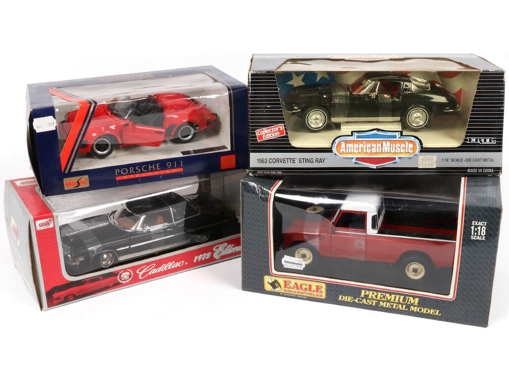échelle : 1/18ème - on y retrouve notamment les marques : MAISTO, ERTL & ANSON - un blister de boîte décollé