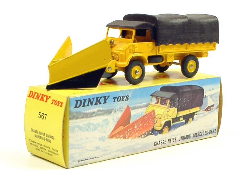 DINKY TOYS (FRANCE) 567 MERCEDES UNIMOG Chasse-neige jaune & noir, bâche marron foncé