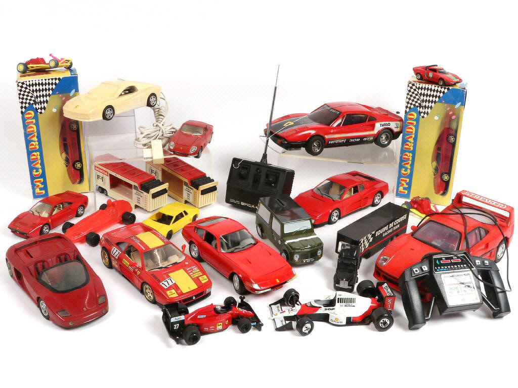 différentes échelles - comprend notamment les modèles : voitures téléguidées (non testées), un téléphone FERRARI (non testé) & 1 FERRARI radio (non testée) - avec manques & parties cassées - boîtes en état 'c'