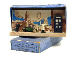 produit de 1935 à 1940 - comprend la cabine de police (42A), le side-car (42B), l'agent de circulation avec une capote blanche (42C) & le policeman (42D) - traces de métal fatigue sur la caisse du side-car - BEL ETAT GENERAL POUR CE COFFRET D'AVANT-GUERRE !
