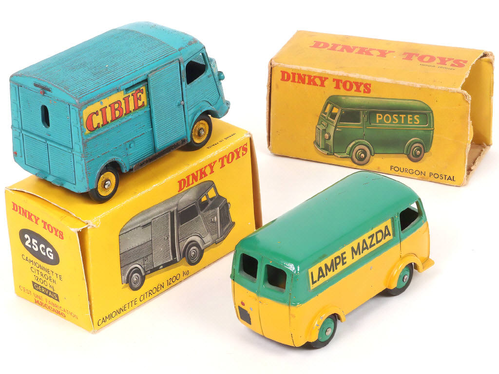 comprend : CITROËN 1200 KG 'CIBIE' (état 'D'.'b', boîte non conforme, quelques accrocs & annotations sur la boîte) & PEUGEOT D3A 'LAMPE MAZDA' (état 'C'.'e', un pneu coupé, boîte incomplète)