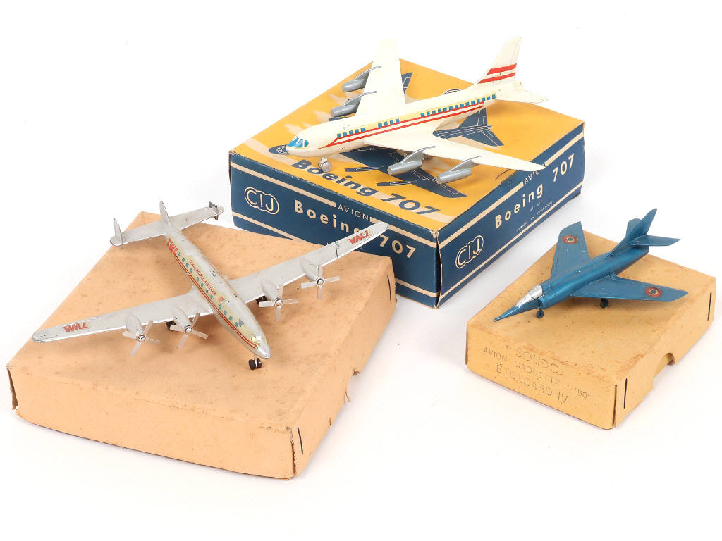 on y retrouve notamment les marques : C.I.J & SOLIDO (traces de métal fatigue plus ou moins importantes sur les 2 exemplaires de la marque, principalement sur le SUPER CONSTELLATION avec quelques manques de matière) - les boîtes sont en état 'b' (plus ou moins tachées pour 2 d’entre elles)