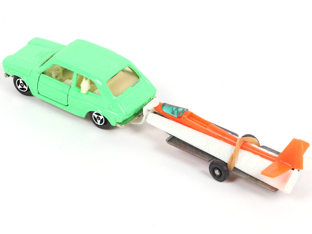MAJORETTE (FRANCE) 323 FIAT 127 avec planeur sur remorque vert clair, orange & blanc