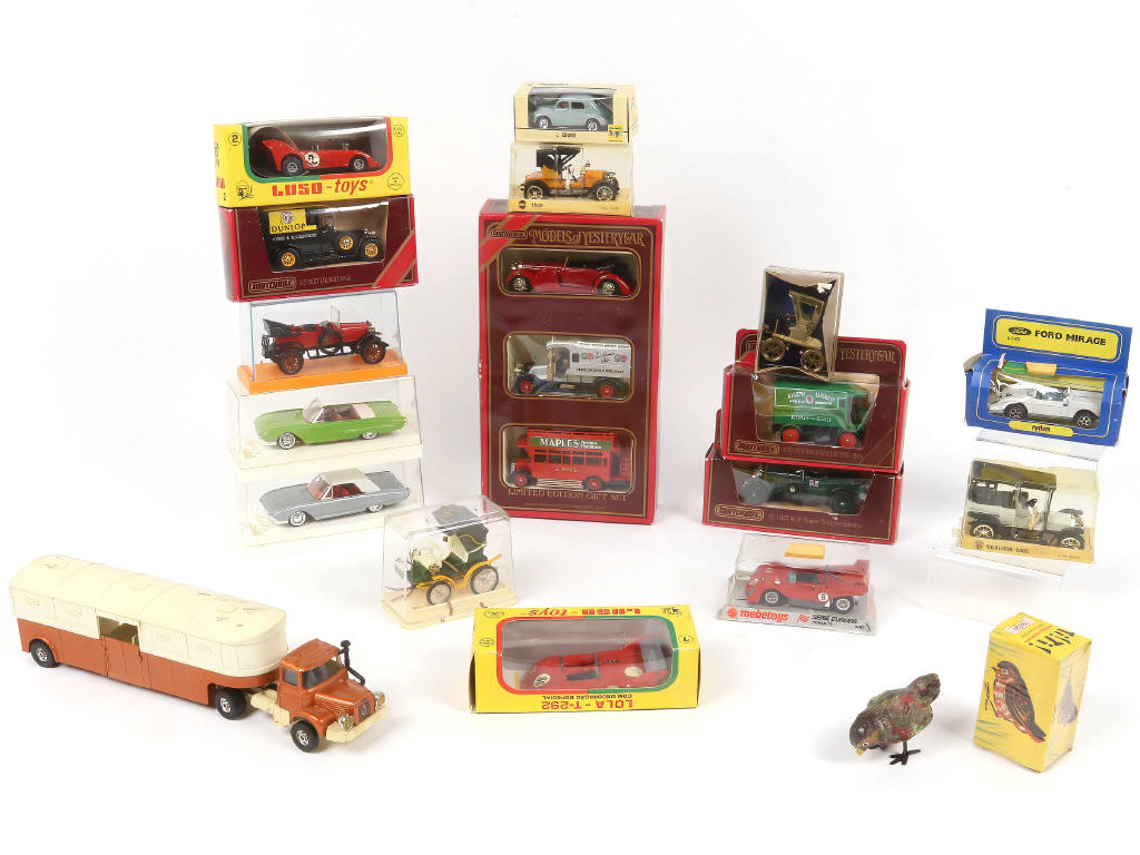 comprend notamment la marque MATCHBOX - possibilité de petits manques & parties cassées - on y joint un oiseau mécanique de la marque GEGE (fonctionne) - boîtes en état 'b & c'