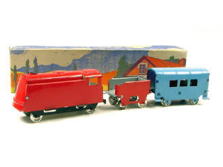 DIVERS (FRANCE) 3 Petit train en tôle peinte rouge, bleu ciel & noir