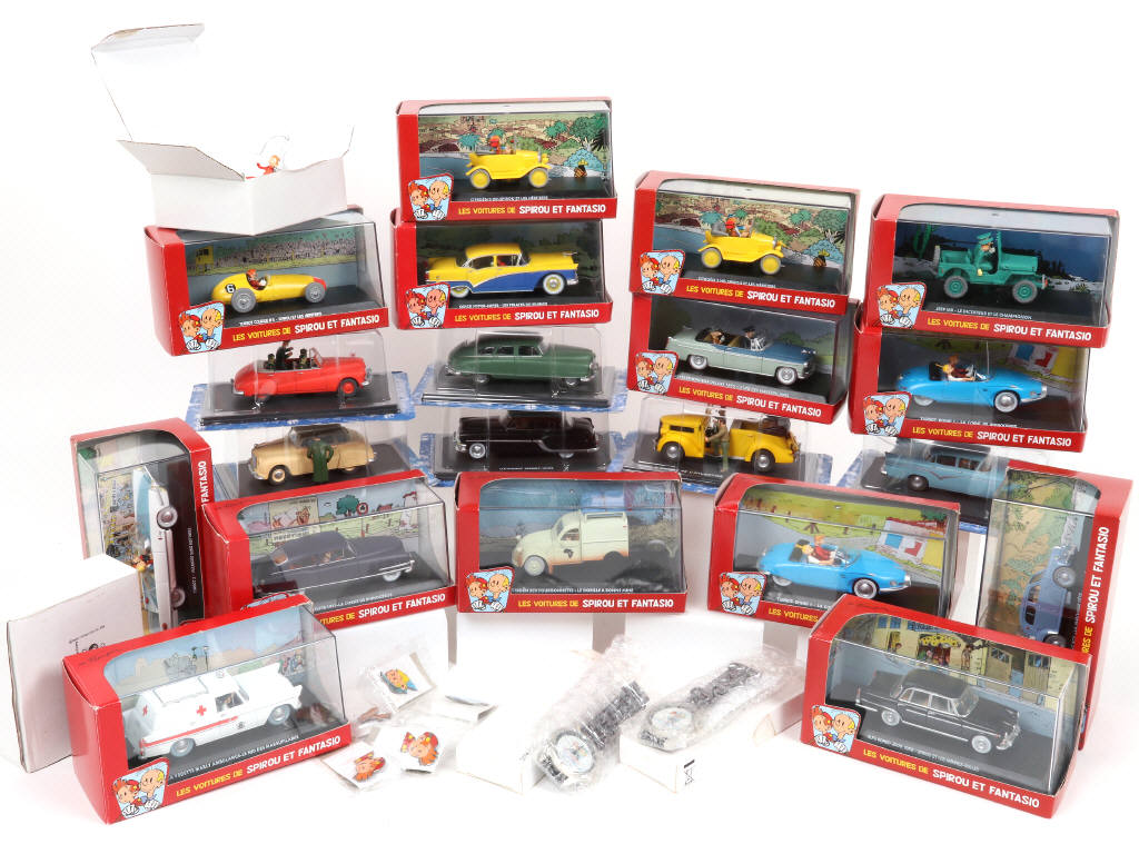 comprend les collections : BLAKE & MORTIMER & SPIROU (avec fascicules, un exemplaires en état 'E' avec importantes traces de métal fatigue & parties cassées) - on y retrouve les marques : EDITIONS HACHETTE & ATLAS - on y joint 9 produits dérivés dont 2 montres (non testées)