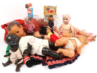 différentes compositions - on y retrouve notamment 2 poupées 'JEUX OLYMPIQUES GRENOBLE 1968' en boîte (état 'c') - avec manques & parties cassées