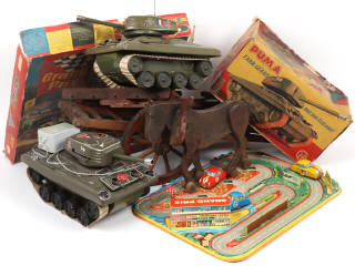 DIVERS Ensemble de 2 chars de combat, une charrette avec cheval & un circuit en tôle lithographiée