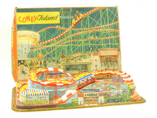 dimensions : 54 x 37 cm - mécanisme à ressort (fonctionne) - avec une voiture de fête foraine - en action, les voitures remontent la côte puis descendent le circuit - fonctionne de manière aléatoire - manque une des voitures