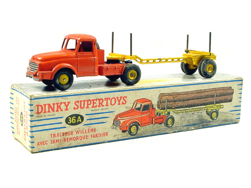 DINKY TOYS (FRANCE) 36A WILLEME Fardier (version avec jantes convexes & remorque ajourée) orange & jaune