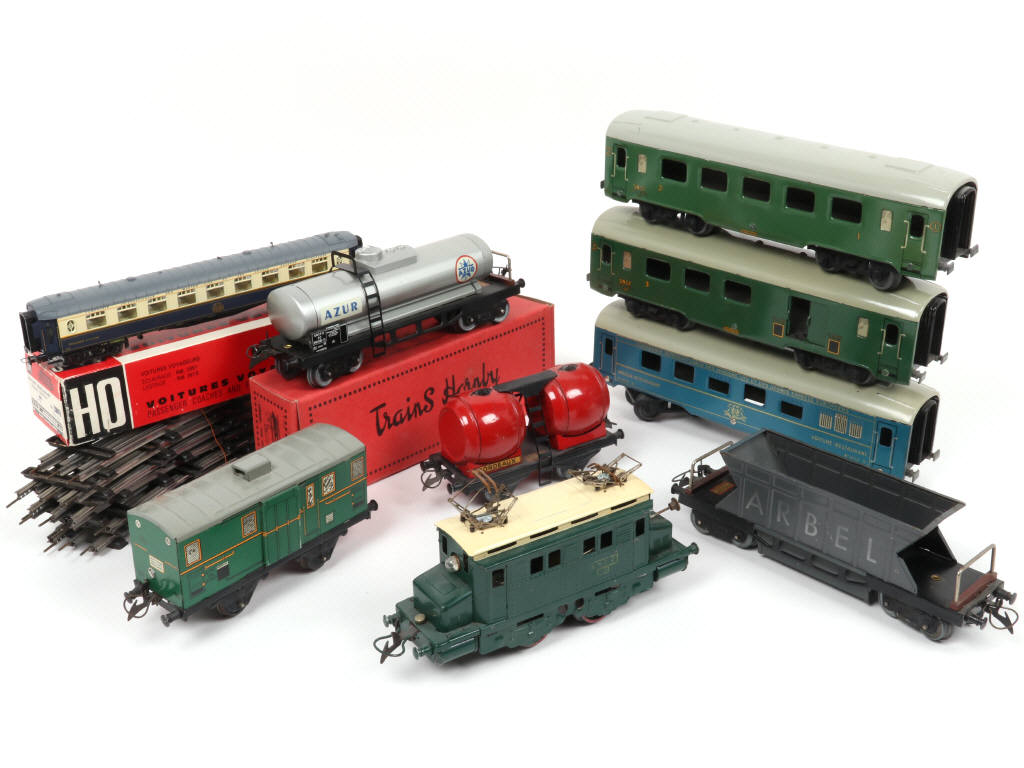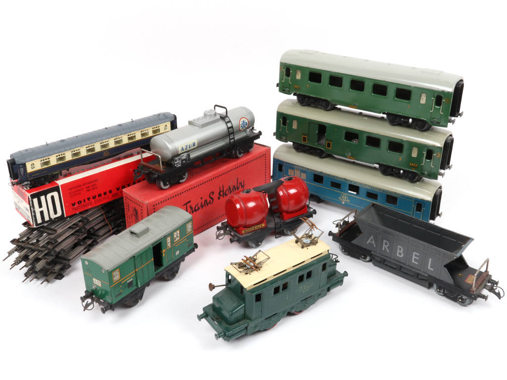 non testé - on y retrouve les marques : JEP & HORNBY - un exemplaire en boîte (état 'b') - quelques manques sur certains exemplaires (dont motrice électrique restaurée) - on y joint un ensemble de rails métalliques de la marque JEP & une voiture PULLMAN de la marque JOUEF (écartement HO, boîte non conforme en état 'c') - un exemplaire présenté sur la dernière photo