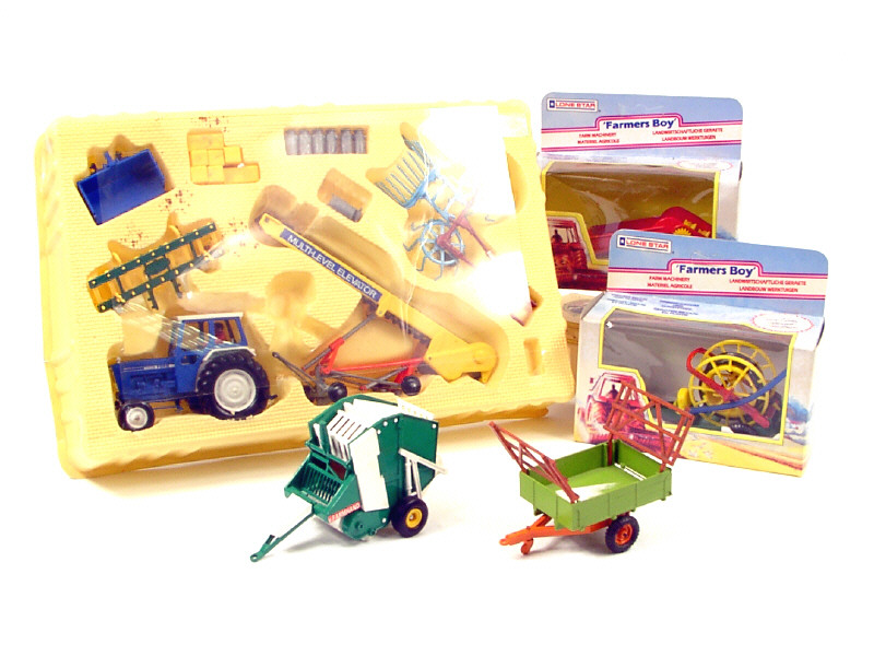 contient : un tracteur FORD 6600 (manque cheminée), un élévateur, un godet, une herse, une faneuse, 8 sacs, 6 pots à lait & 7 bottes de foin - avec fond de boîte